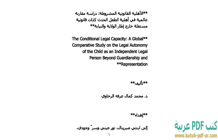 تحميل كتاب الأهلية القانونية المشروطة PDF – محمد كمال الرخاوي – يتناول كتاب "الأهلية القانونية المشروطة" للدكتور محمد كمال الرخاوي موضوعًا حيويًا يتعلق بأهلية الطفل الحدث كذات قانونية مستقلة. يركز الكتاب على تحليل مفهوم الأهلية القانونية وكيف يمكن أن تكون مشروطة، مع تقديم دراسة مقارنة عالمية تستعرض التجارب المختلفة في هذا المجال. يسعى المؤلف إلى إلقاء الضوء على التحديات والفرص التي يواجهها الأطفال في سياق حقوقهم القانونية ومدى قدرتهم على ممارسة هذه الحقوق دون الحاجة إلى ولاية أو نيابة.