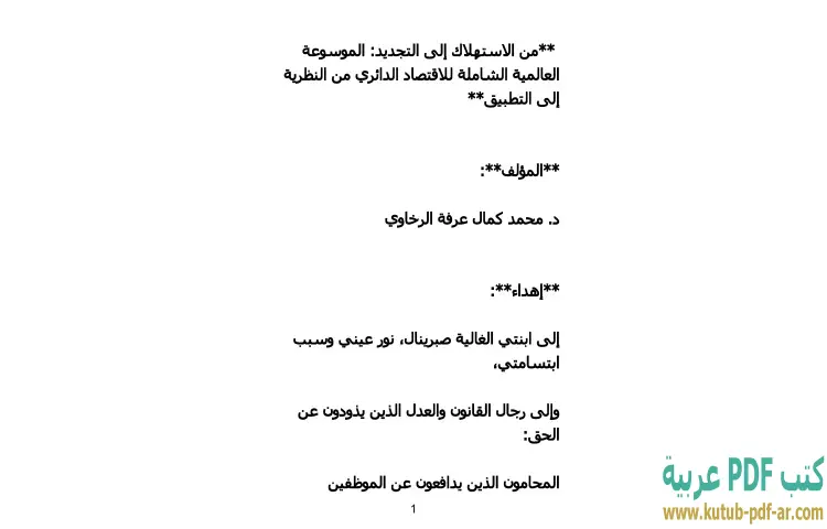 تحميل كتاب الاستهلاك إلى التجديد PDF – محمد كمال الرخاوي – يتناول كتاب "الاستهلاك إلى التجديد: الموسوعة العالمية الشاملة للاقتصاد الدائري من النظرية إلى التطبيق" لمؤلفه دكتور محمد كمال الرخاوي مفهوم الاقتصاد الدائري بشكل شامل ومفصل. يقدم الكتاب دراسة تتجاوز السرد التقليدي للاقتصاد، حيث يركز على كيفية تحول الأنظمة الاقتصادية من نماذج خطية تعتمد على "اخذ-صنع-التخلص" إلى أنظمة دائرية تعزز الاستدامة وإعادة الاستخدام. يستعرض الرخاوي في هذا الكتاب الأسس النظرية للاقتصاد الدائري، موضحًا أهميته في مواجهة التحديات البيئية والاقتصادية المعاصرة.