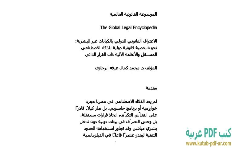 تحميل كتاب الاعتراف القانوني الدولي بالكيانات غير البشرية PDF – محمد كمال الرخاوي – يتناول كتاب "الاعتراف القانوني الدولي بالكيانات غير البشرية" لمؤلفه دكتور محمد كمال الرخاوي موضوعًا حديثًا ومثيرًا يتمحور حول إمكانية منح الذكاء الاصطناعي المستقل والأنظمة الآلية ذات القرار الذاتي شخصية قانونية دولية. يستعرض الكتاب التحديات القانونية والأخلاقية المرتبطة بهذا الموضوع، ويقدم رؤى حول كيفية التعامل مع هذه الكيانات التي تتخطى حدود البشرية.