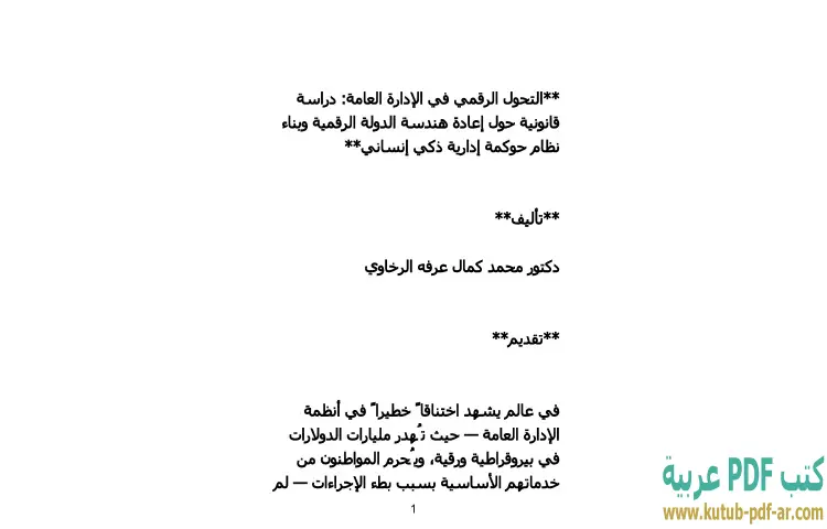 تحميل كتاب التحول الرقمي في الإدارة العامة PDF – محمد كمال الرخاوي – يتناول كتاب "التحول الرقمي في الإدارة العامة: دراسة قانونية حول إعادة هندسة الدولة الرقمية وبناء نظام حوكمة إدارية ذكي إنساني" للدكتور محمد كمال الرخاوي موضوعًا حيويًا في عصر التكنولوجيا الحديثة. يستعرض الكتاب كيف يمكن للتحول الرقمي أن يحدث تغييرًا جذريًا في الهياكل الإدارية الحكومية، مؤكدًا على أهمية إعادة هندسة العمليات الإدارية لتلبية احتياجات المجتمع المعاصر. يسلط المؤلف الضوء على العلاقة بين التكنولوجيا والقانون، وكيف يمكن أن تسهم في تطوير أنظمة حوكمة أكثر كفاءة وشفافية.