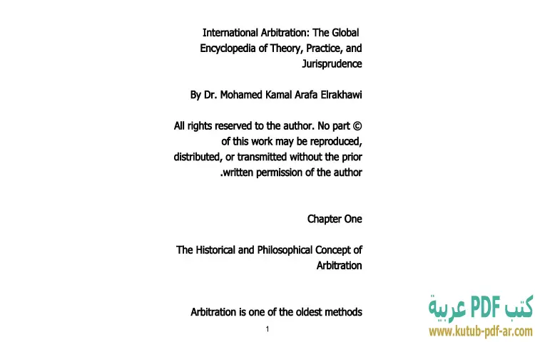 تحميل كتاب الترجمة الإنجليزية لكتاب التحكيم الدولي PDF – محمد كمال الرخاوي – يقدم كتاب "التحكيم الدولي: الموسوعة العالمية للنظرية والممارسة والفقه القضائي" لمؤلفه الدكتور محمد كمال الرخاوي نظرة شاملة ومعمقة حول موضوع التحكيم الدولي، حيث يعد مرجعًا مهمًا لكل المهتمين بهذا المجال. يتناول الكتاب جوانب متعددة من التحكيم، بدءًا من النظريات الأساسية وصولاً إلى الممارسات العملية، مما يجعله مفيدًا للباحثين والطلاب والممارسين على حد سواء.