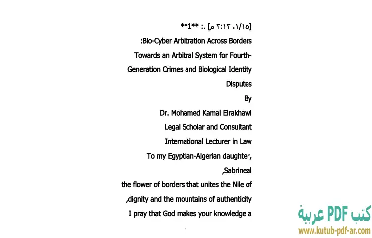 تحميل كتاب الترجمة الإنجليزية لكتاب التحكيم البيو-سيبراني العابر للحدود PDF – محمد كمال الرخاوي – يتناول كتاب "التحكيم البيو-سيبراني العابر للحدود" للدكتور محمد كمال الرخاوي مفهوم التحكيم في ظل التطورات التكنولوجية والبيولوجية الحديثة. يسعى الكتاب إلى تقديم نظام تحكيمي يناسب الجرائم من الجيل الرابع والنزاعات المتعلقة بالهوية البيولوجية. من خلال تحليل السياقات القانونية والاجتماعية، يستعرض المؤلف التحديات التي تواجه التحكيم التقليدي وكيف يمكن تكييفه لمواكبة هذه التغيرات.