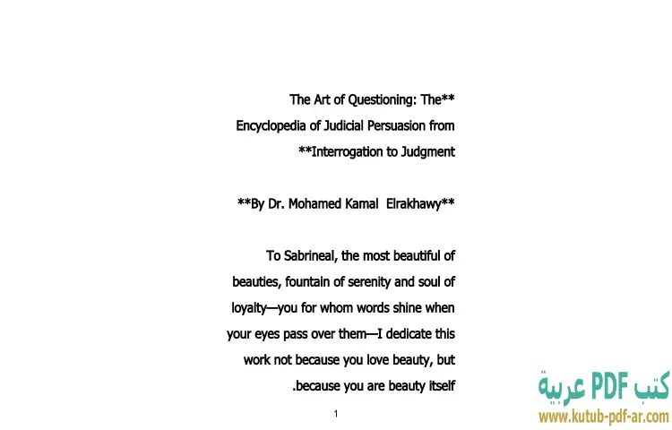 تحميل كتاب الترجمة الإنجليزية لموسوعة فن السؤال PDF – محمد كمال الرخاوي – يستعرض كتاب "فن السؤال: موسوعة الإقناع القضائي من الاستجواب إلى الحكم" للدكتور محمد كمال الرخاوي موضوعًا بالغ الأهمية في مجال القانون والإقناع. يتناول الكتاب فنون وأساليب الاستجواب وكيفية استخدامها للتأثير على القرارات القضائية. يعتمد الدكتور الرخاوي على خبرته الطويلة في هذا المجال ليقدم للقارئ منهجيات عملية مستندة إلى نظرية الإقناع، مما يجعله مرجعًا قيمًا للمتخصصين والمهتمين بالقانون.