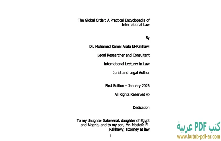 تحميل كتاب الترجمة الإنجليزية لموسوعة القانون الدولي العملي PDF – محمد كمال الرخاوي – تتناول موسوعة "النظام العالمي: موسوعة عملية للقانون الدولي" التي كتبها الدكتور محمد كمال الرخاوي موضوعات متنوعة في مجال القانون الدولي بطريقة شاملة ودقيقة. يهدف الكتاب إلى تقديم مرجع موثوق لكل من يبحث في القضايا القانونية الدولية، حيث يبرز أهمية الفهم العميق للقوانين التي تحكم العلاقات بين الدول. يتمتع الدكتور الرخاوي بخبرة واسعة كأكاديمي ومستشار قانوني، مما يضيف مصداقية كبيرة لمحتوى الكتاب.