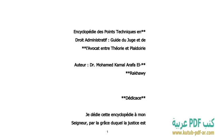 تحميل كتاب الترجمة الفرنسية لموسوعة النقاط الفنية في القانون الإداري PDF – محمد كمال الرخاوي – كتاب "موسوعة النقاط الفنية في القانون الإداري: دليل القاضي والمحامي بين النظرية والجدل" هو عمل متميز للدكتور محمد كمال الرخاوي، يقدم فيه رؤية شاملة ومعمقة لمجالات القانون الإداري. يهدف الكتاب إلى تقديم مرجع شامل للقضاة والمحامين، حيث يركز على النقاط الفنية التي تبرز في الممارسات القانونية اليومية. يتناول الكتاب العلاقة بين النظرية والتطبيق، مما يجعله مفيدًا لكل من يسعى لفهم التعقيدات التي قد تواجه الممارسين في هذا المجال.