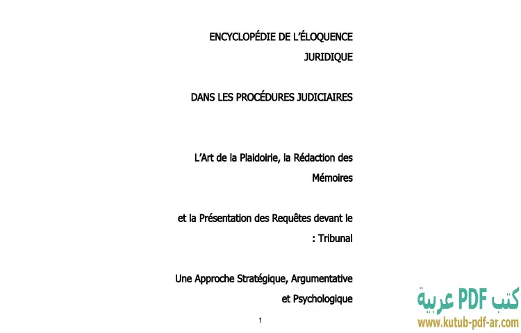 تحميل كتاب الترجمة الفرنسية لموسوعة براعة المحامي في الإجراءات القضائية PDF – محمد كمال الرخاوي – تقدم موسوعة براعة المحامي في الإجراءات القضائية، التي كتبها الدكتور محمد كمال الرخاوي، دراسة شاملة حول فنون الإقناع القانوني وآليات العرض في المحاكم. تتناول هذه الموسوعة تفاصيل فنون المرافعة وكتابة المذكرات، بالإضافة إلى استراتيجيات تقديم الطلبات أمام المحكمة. تعد هذه الأعمال ضرورية للمحامين والطلبة في كليات الحقوق، حيث توفر لهم الأدوات اللازمة للتفوق في مجالاتهم.
