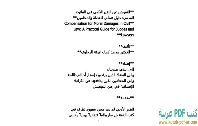 تحميل كتاب التعويض عن الضرر الأدبي في القانون المدني PDF – محمد كمال الرخاوي – يقدم كتاب "التعويض عن الضرر الأدبي في القانون المدني – دليل عملي للقضاة والمحامين" للدكتور محمد كمال الرخاوي دراسة شاملة لمفاهيم التعويض عن الأضرار الأدبية، حيث يعتبر هذا الموضوع من الجوانب القانونية المهمة التي تحتاج إلى فهم دقيق. يسعى المؤلف من خلال هذا الكتاب إلى تسليط الضوء على كيفية التعامل مع التعويضات التي تتعلق بالأضرار النفسية والعاطفية، والتي غالبًا ما تكون غير ملموسة ولكنها تؤثر بشكل كبير على الأفراد.