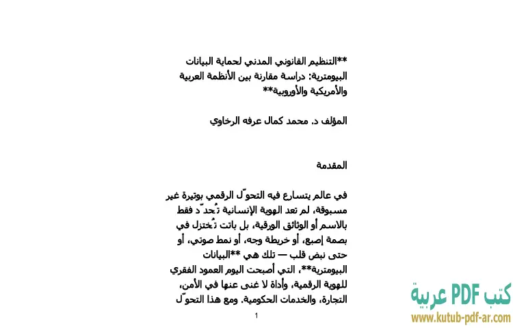 تحميل كتاب التنظيم القانوني المدني لحماية البيانات البيومترية PDF – محمد كمال الرخاوي – يستعرض كتاب "التنظيم القانوني المدني لحماية البيانات البيومترية" للدكتور محمد كمال الرخاوي موضوعًا معاصرًا يكتسب أهمية متزايدة في ظل التطورات التكنولوجية السريعة. يتناول المؤلف في هذا الكتاب كيفية تنظيم القوانين المدنية لحماية البيانات البيومترية، وهي البيانات التي ترتبط بالخصائص الفريدة للفرد مثل بصمات الأصابع، صور الوجه، وأصوات الصوت. يهدف الرخاوي من خلال دراسته إلى تقديم مقارنة شاملة بين الأنظمة القانونية في العالم العربي والنظامين الأمريكي والأوروبي، مما يسلط الضوء على الفروقات والتشابهات في كيفية التعامل مع هذه البيانات الحساسة.