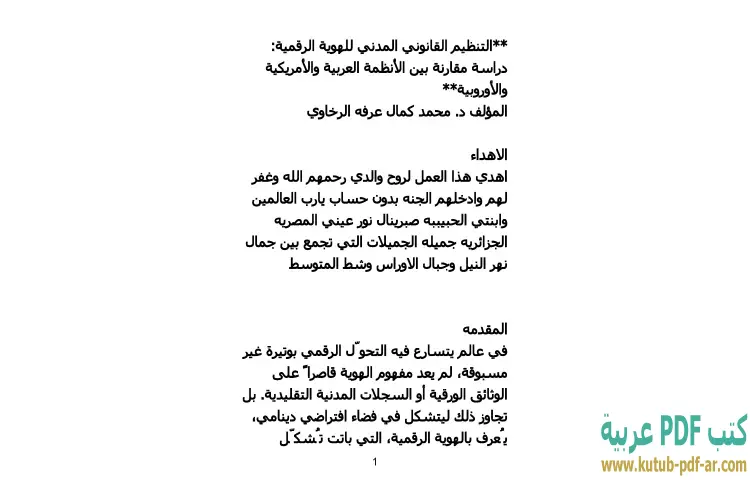 تحميل كتاب التنظيم القانوني المدني للهوية الرقمية PDF – محمد كمال الرخاوي – يتناول كتاب "التنظيم القانوني المدني للهوية الرقمية" للدكتور محمد كمال الرخاوي دراسة تحليلية شاملة تتناول موضوع الهوية الرقمية من جوانب قانونية متعددة. يهدف الكتاب إلى تقديم فهم عميق للأطر القانونية التي تحكم الهوية الرقمية، مع التركيز على الفروقات بين الأنظمة القانونية العربية والأمريكية والأوروبية. يتناول المؤلف في هذا العمل التحديات التي تواجه الهوية الرقمية وكيفية تنظيمها لحماية حقوق الأفراد وضمان سلامتهم في الفضاء الرقمي.