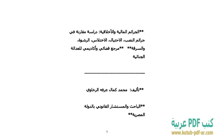 تحميل كتاب الجرائم المالية والأخلاقية PDF – محمد كمال الرخاوي – يتناول كتاب "الجرائم المالية والأخلاقية" للدكتور محمد كمال الرخاوي موضوعًا حيويًا ومتعدد الأبعاد، حيث يسلط الضوء على مجموعة من الجرائم التي تؤثر على الاقتصاد والمجتمع. يقدم الكتاب دراسة مقارنة حول جرائم النصب والاحتيال والاختلاس والرشوة والسرقة، مما يعكس عمق التحليل الذي يقدمه المؤلف في سياق الجرائم المالية. يهدف الكتاب إلى تقديم فهم شامل لهذه الجرائم، حيث يتم تناول كل نوع منها من حيث الأسباب والآثار والعوامل المؤثرة.