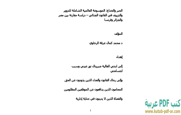 تحميل كتاب الحبر والخداع PDF – محمد كمال الرخاوي – يستعرض كتاب "الحبر والخداع: الموسوعة العالمية الشاملة للتزوير والتزييف في القانون الجنائي" للدكتور محمد كمال الرخاوي موضوعًا بالغ الأهمية يتناول ظاهرة التزوير والتزييف من منظور قانوني مقارنة بين ثلاثة دول هي مصر والجزائر وفرنسا. يقدم الكتاب دراسة شاملة حول أنواع التزوير وأشكاله المختلفة، مع التركيز على القوانين والأنظمة المعمول بها في كل من هذه الدول، مما يوفر للقارئ فهماً عميقاً لمجال القانون الجنائي في سياق التزوير.