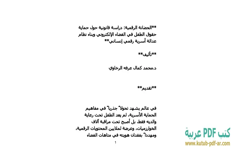 تحميل كتاب الحضانة الرقمية PDF – محمد كمال الرخاوي – يتناول كتاب "الحضانة الرقمية: دراسة قانونية حول حماية حقوق الطفل في الفضاء الإلكتروني وبناء نظام عدالة أسرية رقمي إنساني" للدكتور محمد كمال الرخاوي موضوعًا حيويًا يتزايد أهميته مع تزايد استخدام التكنولوجيا في حياة الأطفال. يسلط المؤلف الضوء على التحديات القانونية والأخلاقية المرتبطة بحماية حقوق الأطفال في ظل الفضاء الإلكتروني الذي يفتقر إلى الضوابط الكافية. يسعى الكتاب إلى تقديم إطار قانوني شامل يعالج قضايا الحضانة الرقمية وكيفية ضمان حقوق الأطفال في العالم الرقمي.