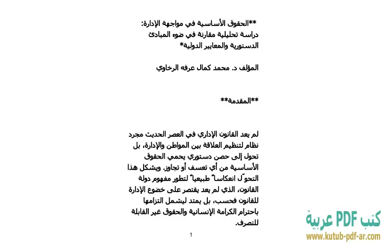 تحميل كتاب الحقوق الأساسية في مواجهة الإدارة PDF – محمد كمال الرخاوي – يتناول كتاب "الحقوق الأساسية في مواجهة الإدارة" للدكتور محمد كمال الرخاوي موضوعًا بالغ الأهمية في مجال الحقوق والحريات العامة. يقدم الكتاب دراسة تحليلية مقارنة تسلط الضوء على كيفية حماية الحقوق الأساسية للأفراد في مواجهة السلطات الإدارية. يستند المؤلف إلى المبادئ الدستورية المعترف بها عالميًا، وكذلك المعايير الدولية التي تسهم في تعزيز هذه الحقوق، مما يثري النقاش حول دور الدولة في حماية حقوق مواطنيها.