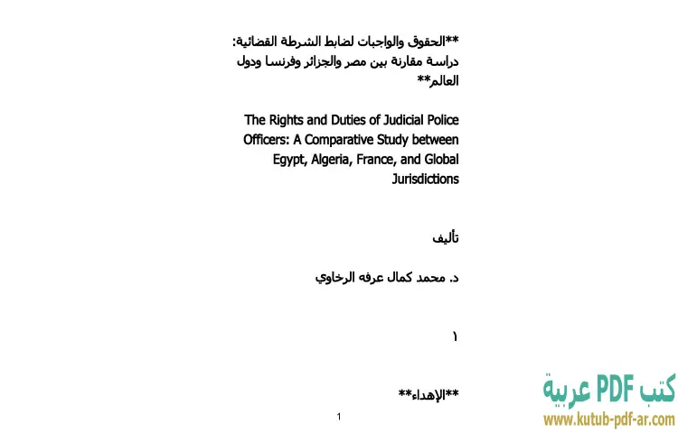 تحميل كتاب الحقوق والواجبات لضابط الشرطة القضائية PDF – محمد كمال الرخاوي – يتناول كتاب "الحقوق والواجبات لضابط الشرطة القضائية" للدكتور محمد كمال الرخاوي موضوعًا حيويًا في مجال القانون الجنائي وحقوق الإنسان. يستعرض الكتاب دراسة مقارنة بين أنظمة حقوق وواجبات ضباط الشرطة القضائية في كل من مصر والجزائر وفرنسا، بالإضافة إلى أمثلة من دول أخرى حول العالم. يهدف المؤلف من خلال هذا العمل إلى تقديم تحليل شامل يساهم في فهم الدور الحيوي الذي تلعبه الشرطة القضائية في تحقيق العدالة وحماية الحقوق الفردية.