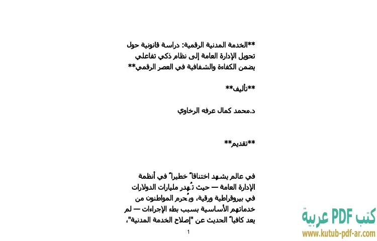 تحميل كتاب الخدمة المدنية الرقمية PDF – محمد كمال الرخاوي – في إطار التحولات الرقمية التي يشهدها العالم اليوم، يأتي كتاب "الخدمة المدنية الرقمية: دراسة قانونية" للدكتور محمد كمال الرخاوي كعمل أكاديمي يسعى إلى تحليل كيف يمكن للإدارة العامة أن تتطور لتصبح أكثر كفاءة وشفافية من خلال اعتماد الأنظمة الذكية التفاعلية. يتناول الكتاب التحديات القانونية التي تواجه هذا التحول، من خلال دراسة معمقة لمفاهيم الإدارة الرقمية وأثرها على الخدمة المدنية.