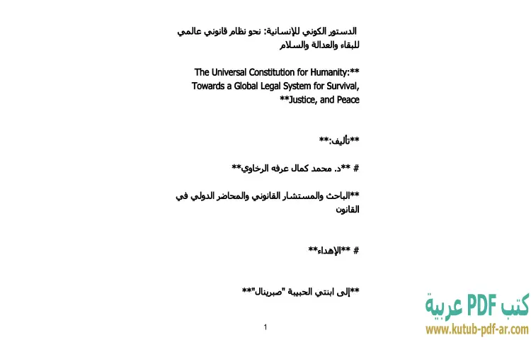 تحميل كتاب الدستور الكوني للإنسانية PDF – محمد كمال الرخاوي – "الدستور الكوني للإنسانية: نحو نظام قانوني عالمي للبقاء والعدالة والسلام" هو عمل فكري عميق للدكتور محمد كمال الرخاوي، يتناول فيه مفهوم النظام القانوني العالمي الذي يهدف إلى تحقيق العدالة والسلام بين الشعوب. يسعى الكتاب إلى تقديم رؤية شاملة حول كيفية بناء إطار قانوني يمكن أن يضمن حقوق الإنسان ويسهم في الحفاظ على الأمن والاستقرار العالمي. يعكس الرخاوي من خلال صفحات الكتاب التحديات المعاصرة التي تواجه الإنسانية، ويطرح حلولاً قانونية تساهم في تعزيز التعاون بين الدول.