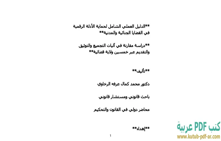 تحميل كتاب الدليل العملي الشامل لحماية الأدلة الرقمية في القضايا الجنائية والمدنية PDF – محمد كمال الرخاوي – كتاب "الدليل العملي الشامل لحماية الأدلة الرقمية في القضايا الجنائية والمدنية" للدكتور محمد كمال الرخاوي يعد مرجعًا هامًا لفهم كيفية التعامل مع الأدلة الرقمية في مختلف الأنظمة القانونية. يتناول الكتاب آليات التجميع والتوثيق والتقديم للأدلة الرقمية عبر خمسين ولاية قضائية، مما يمنح القارئ رؤية شاملة وعميقة حول كيفية إدارة الأدلة في سياقات قانونية متنوعة.