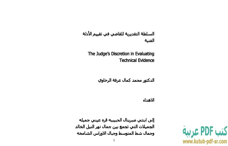 تحميل كتاب السلطة التقديرية للقاضي في تقييم الأدلة الفنية PDF – محمد كمال الرخاوي – يتناول كتاب "السلطة التقديرية للقاضي في تقييم الأدلة الفنية" للدكتور محمد كمال الرخاوي موضوعًا بالغ الأهمية في مجال القانون، حيث يستعرض كيف يمكن للقضاة ممارسة سلطتهم التقديرية في التعامل مع الأدلة الفنية. يسلط الكتاب الضوء على التحديات التي تواجه القضاة عند تقييم هذه الأدلة، خاصة في القضايا التي تتطلب فهماً عميقاً للتخصصات الفنية مثل الطب الشرعي أو الهندسة أو التكنولوجيا.