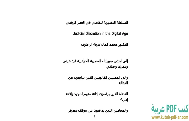 تحميل كتاب السلطة التقديرية للقاضي في العصر الرقمي PDF – محمد كمال الرخاوي – يتناول كتاب "السلطة التقديرية للقاضي في العصر الرقمي" للدكتور محمد كمال الرخاوي مفهوم السلطة التقديرية ودورها في النظام القضائي في زمن التكنولوجيا الحديثة. يسلط المؤلف الضوء على كيفية تأثير التقنيات الرقمية على عمل القضاة وما يتطلبه ذلك من تعديلات في فهمهم واستخدامهم للسلطة التقديرية. يبرز الكتاب التحديات التي تواجه القضاة في عصر يتسم بالتغير السريع في المعلومات ووسائل التواصل، مما يستدعي منهم القدرة على التكيف مع هذه المستجدات.