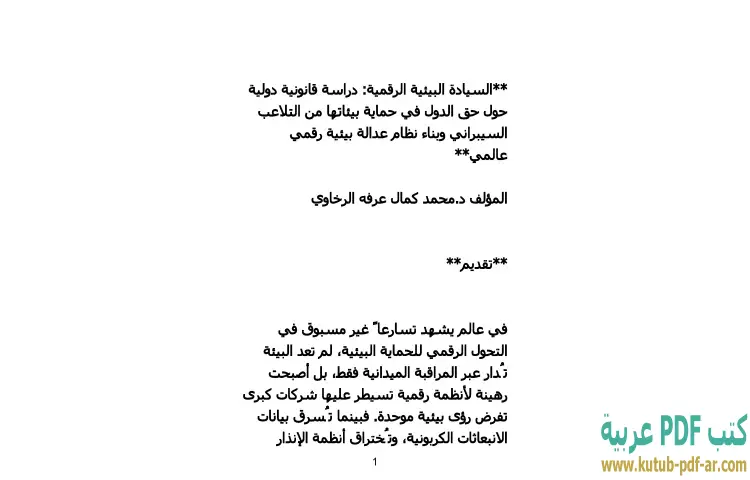 تحميل كتاب السيادة البيئية الرقمية PDF – محمد كمال الرخاوي – يتناول كتاب "السيادة البيئية الرقمية" للدكتور محمد كمال الرخاوي موضوعًا معاصرًا ومهمًا يتعلق بحق الدول في حماية بيئاتها من التلاعب السيبراني. يسعى الكتاب إلى تقديم دراسة قانونية دولية تتناول كيفية بناء نظام عدالة بيئية رقمي عالمي، مما يعكس التحديات التي تواجه الدول في عصر تكنولوجيا المعلومات. يتعمق المؤلف في القضايا القانونية المتعلقة بالسيادة البيئية، موضحًا كيف يمكن للدول أن تتخذ إجراءات لحماية مواردها البيئية في ظل التهديدات الرقمية المتزايدة.