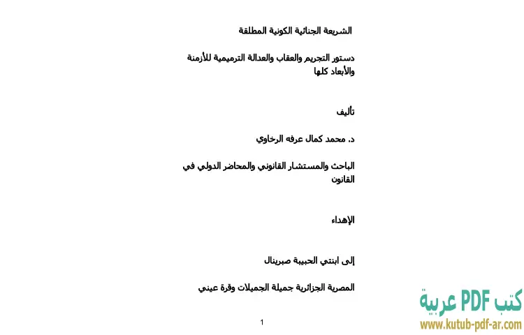 تحميل كتاب الشريعة الجنائية الكونية المطلقة PDF – محمد كمال الرخاوي – "الشريعة الجنائية الكونية المطلقة: دستور التجريم والعقاب والعدالة الترميمية للأزمنة والأبعاد كلها" هو عنوان يحمل في طياته عمق الفكر القانوني والإنساني. يقدّم دكتور محمد كمال الرخاوي رؤية شاملة حول مفهوم الشريعة الجنائية، حيث يستعرض الأسس التي تقوم عليها القوانين الجنائية وضرورة وجود نظام عدالة يضمن حقوق الأفراد والمجتمعات. يتناول الكتاب من خلال تحليلات دقيقة مجموعة من المفاهيم الأساسية مثل التجريم والعقاب، ويطرح تساؤلات حول مدى فعالية النظم القانونية التقليدية في مواجهة التحديات المعاصرة.