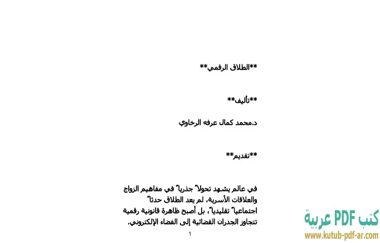 تحميل كتاب الطلاق الرقمي PDF – محمد كمال الرخاوي – "الطلاق الرقمي" هو عمل يقدمه الدكتور محمد كمال الرخاوي، حيث يتناول فيه قضية معاصرة تلامس حياة الأفراد والمجتمعات في عصر التكنولوجيا الحديثة. يتناول الكتاب تأثير التحولات الرقمية على العلاقات الزوجية، وكيف أن وسائل التواصل الاجتماعي، والتطبيقات المختلفة، قد لعبت دورًا محوريًا في تغيير الديناميات الأسرية. يناقش الرخاوي كيف أن الفضاء الرقمي يمكن أن يكون سلاحًا ذا حدين، حيث يسهل التواصل بين الأزواج ولكنه في الوقت ذاته قد يسهم في تفكيك الروابط العاطفية.