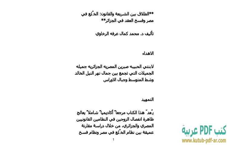 تحميل كتاب الطلاق بين الشريعة والقانون PDF – محمد كمال الرخاوي – يستعرض كتاب "الطلاق بين الشريعة والقانون: الخُلع في مصر وفسخ العقد في الجزائر" للدكتور محمد كمال الرخاوي مفهوم الطلاق من منظورين مختلفين، حيث يسلط الضوء على الفروقات بين الشريعة الإسلامية والقوانين المدنية التي تحكم هذه الظاهرة في كل من مصر والجزائر. يتناول الكتاب بشكل خاص مسألة الخُلع في السياق المصري وفسخ العقد في السياق الجزائري، مما يتيح للقارئ فهم الاختلافات القانونية والاجتماعية التي تحيط بكل منهما.