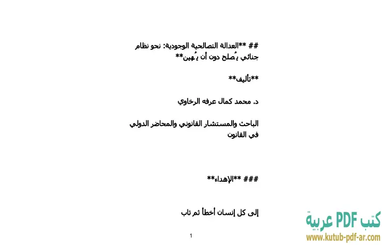 تحميل كتاب العدالة التصالحية الوجودية PDF – محمد كمال الرخاوي – يتناول كتاب "العدالة التصالحية الوجودية: نحو نظام جنائي يُصلح دون أن يُهين" للدكتور محمد كمال الرخاوي مفهوم العدالة التصالحية كبديل للنظم الجنائية التقليدية التي غالبًا ما تركز على العقاب بدلاً من الإصلاح. يقدم الكتاب تحليلًا متعمقًا حول كيفية تحقيق العدالة من خلال الحوار والتفاهم بين الضحايا والمجرمين، مما يعزز من فرص إعادة إدماج المجرمين في المجتمع بدلاً من استبعادهم.