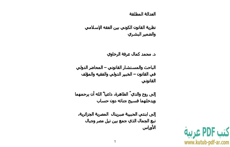 تحميل كتاب العدالة المطلقة PDF – محمد كمال الرخاوي – "العدالة المطلقة: نظرية القانون الكوني بين الفقه الإسلامي والضمير البشري" هو كتاب يتناول موضوع العدالة من منظورين مختلفين؛ الفقه الإسلامي والضمير الإنساني. يقدم المؤلف، دكتور محمد كمال الرخاوي، تحليلاً عميقاً للعلاقة بين القيم الأخلاقية والقوانين التي تحكم المجتمعات. يسعى الكتاب إلى فهم كيفية تفاعل هذه القيم مع الأنظمة القانونية المختلفة وكيف يمكن أن تسهم في تحقيق العدالة الشاملة.