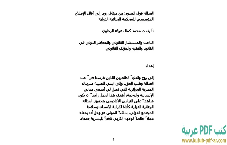 تحميل كتاب العدالة فوق الحدود PDF – محمد كمال الرخاوي – كتاب "العدالة فوق الحدود: من ميثاق روما إلى آفاق الإصلاح المؤسسي للمحكمة الجنائية الدولية" للدكتور محمد كمال الرخاوي يعد دراسة أكاديمية متعمقة تسلط الضوء على تطور المحكمة الجنائية الدولية منذ تأسيسها وحتى اليوم. يقدم الكتاب تحليلاً شاملاً للميثاق الذي أرسى قواعد المحكمة وأثر ذلك على النظام القانوني الدولي، مستعرضًا التحديات والنجاحات التي واجهتها المحكمة في سياق تطبيق العدالة الجنائية.