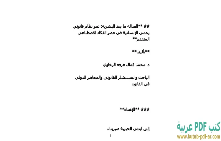 تحميل كتاب العدالة ما بعد البشرية PDF – محمد كمال الرخاوي – يستعرض كتاب "العدالة ما بعد البشرية: نحو نظام قانوني يحمي الإنسانية في عصر الذكاء الاصطناعي المتقدم" للدكتور محمد كمال الرخاوي مجموعة من الأفكار الرائدة حول مستقبل القانون والعدالة في ظل التقدم التكنولوجي السريع. يسعى الكتاب إلى تقديم رؤية شاملة حول كيفية تأثير الذكاء الاصطناعي على القوانين التي تحكم المجتمع، ويحلل التحديات التي قد تواجه الإنسانية جراء هذا التطور. يطرح الرخاوي أسئلة محورية تتعلق بالمسؤولية القانونية والأخلاقية للكيانات الذكية، وكيف يمكن أن تتكيف الأنظمة القانونية التقليدية مع هذا الواقع المتغير.