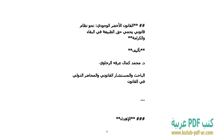 تحميل كتاب القانون الأخضر الوجودي PDF – محمد كمال الرخاوي – "القانون الأخضر الوجودي: نحو نظام قانوني يحمي حق الطبيعة في البقاء والكرامة" هو عمل فكري يتناول مسألة حيوية تتعلق بحقوق الطبيعة. حيث يسعى الدكتور محمد كمال الرخاوي إلى تقديم رؤية قانونية جديدة تعزز من حماية البيئة وتضمن حقوقها في السياقات القانونية المعاصرة. يتناول الكتاب التأثيرات السلبية التي تتعرض لها الطبيعة نتيجة الأنشطة البشرية، ويطرح ضرورة وجود إطار قانوني يضمن عدم انتهاك هذه الحقوق.