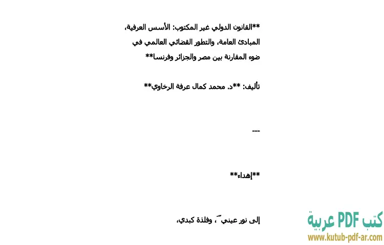 تحميل كتاب القانون الدولي غير المكتوب PDF – محمد كمال الرخاوي – يتناول كتاب "القانون الدولي غير المكتوب" للدكتور محمد كمال الرخاوي موضوعًا هامًا في مجال القانون الدولي، حيث يستعرض الأسس العرفية والمبادئ العامة لهذا القانون، بالإضافة إلى التطورات القضائية العالمية. الكتاب يبرز أهمية القانون الدولي غير المكتوب في تنظيم العلاقات بين الدول ويشير إلى كيفية تأثير العوامل الثقافية والاجتماعية في تشكيل هذه القواعد.