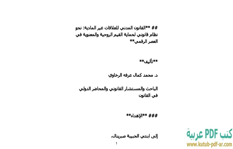 تحميل كتاب القانون المدني للعلاقات غير المادية PDF – محمد كمال الرخاوي – يقدم دكتور محمد كمال الرخاوي في كتابه "القانون المدني للعلاقات غير المادية" دراسة شاملة حول كيفية حماية القيم الروحية والمعنوية في عصر تكنولوجيا المعلومات. يركز الكتاب على أهمية تطوير نظام قانوني يتناسب مع التغيرات الاجتماعية والتكنولوجية المتسارعة، ويطرح أفكارًا جديدة حول كيفية التعامل مع العلاقات غير المادية التي ظهرت نتيجة للاستخدام المتزايد للإنترنت ووسائل التواصل الاجتماعي.