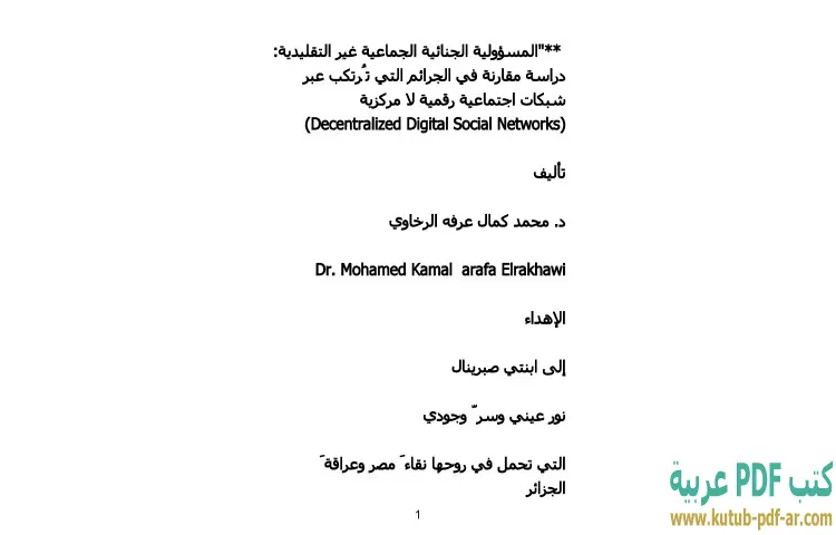 تحميل كتاب المسؤولية الجنائية الجماعية غير التقليدية PDF – محمد كمال الرخاوي – يتناول كتاب "المسؤولية الجنائية الجماعية غير التقليدية" للدكتور محمد كمال الرخاوي موضوعًا معاصرًا يتعلق بالجرائم المرتكبة عبر الشبكات الاجتماعية الرقمية اللامركزية. يناقش الكتاب كيفية تأثير هذه الشبكات على المسؤولية الجنائية، متناولًا تطور المفاهيم القانونية في ظل التغيرات التكنولوجية السريعة. يعرض الرخاوي من خلال دراسته مقارنة بين الأنظمة القانونية المختلفة، مما يتيح للقارئ فهمًا أعمق للمسؤوليات القانونية للأفراد والمجموعات في الفضاء الرقمي.
