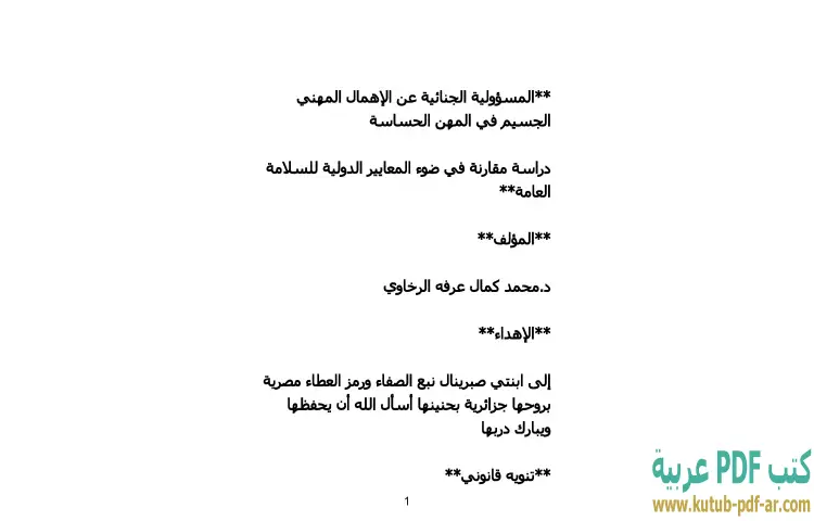 تحميل كتاب المسؤولية الجنائية عن الإهمال المهني الجسيم في المهن الحساسة PDF – محمد كمال الرخاوي – يستعرض كتاب "المسؤولية الجنائية عن الإهمال المهني الجسيم في المهن الحساسة" للكاتب الدكتور محمد كمال الرخاوي موضوعًا مهمًا يتعلق بالمسؤولية القانونية للأفراد العاملين في مجالات ذات حساسية عالية. يعتمد الكتاب على دراسة مقارنة للمسؤولية الجنائية، مستعرضًا المعايير الدولية للسلامة العامة وكيفية تطبيقها في السياقات المختلفة. يتناول الكتاب الأبعاد القانونية والإجرائية التي تحكم هذه المسؤولية، مما يجعله مرجعًا علميًا قيمًا للباحثين والممارسين في المجال القانوني.