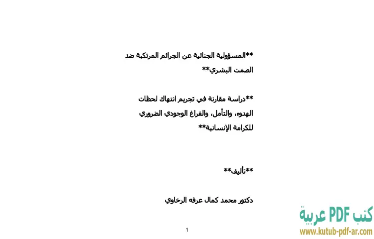 تحميل كتاب المسؤولية الجنائية عن الجرائم المرتكبة ضد الصمت البشري PDF – محمد كمال الرخاوي – يستعرض كتاب "المسؤولية الجنائية عن الجرائم المرتكبة ضد الصمت البشري" للدكتور محمد كمال الرخاوي موضوعًا فريدًا يعكس أهمية الصمت كحق إنساني أساسي. يتناول الكتاب الجوانب القانونية والنفسية والاجتماعية المتعلقة بانتهاك لحظات السكون والهدوء، مشددًا على ضرورة حماية هذه اللحظات التي تعتبر ضرورية للكرامة الإنسانية. يتناول الرخاوي كيفية تجريم هذه الانتهاكات، ويقدم دراسة مقارنة تسلط الضوء على القوانين والتشريعات المتعلقة بالصمت في مختلف الثقافات.
