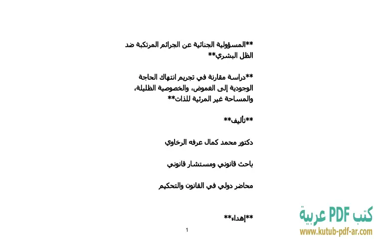 تحميل كتاب المسؤولية الجنائية عن الجرائم المرتكبة ضد الظل البشري PDF – محمد كمال الرخاوي – يتناول كتاب "المسؤولية الجنائية عن الجرائم المرتكبة ضد الظل البشري" للدكتور محمد كمال الرخاوي دراسة مقارنة تتعمق في تجريم انتهاك الحاجة الوجودية إلى الغموض والخصوصية الظليلة. يسعى الكتاب إلى تحليل كيف تؤثر هذه الانتهاكات على الهوية الإنسانية ويستعرض الأبعاد القانونية والأخلاقية المرتبطة بها. من خلال استخدام أمثلة واقعية، يقدم المؤلف رؤية شاملة عن طبيعة هذه الجرائم وكيفية تعامل القوانين معها في مختلف الأنظمة.
