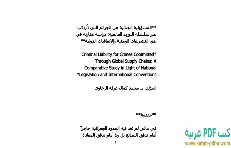تحميل كتاب المسؤولية الجنائية عن الجرائم التي ترتكب عبر سلسلة التوريد العالمية PDF – محمد كمال الرخاوي – يقدم دكتور محمد كمال الرخاوي في كتابه "المسؤولية الجنائية عن الجرائم التي تُرتكب عبر سلسلة التوريد العالمية" دراسة تحليلية معمقة تتناول موضوعًا حيويًا في ظل العولمة والتجارة الدولية. يستعرض الكتاب التحديات القانونية التي تواجهها الدول في محاسبة الأفراد والشركات على الجرائم المرتبطة بسلسلة التوريد، حيث تتداخل العوامل المحلية والدولية في تشكيل هذه المسؤولية.