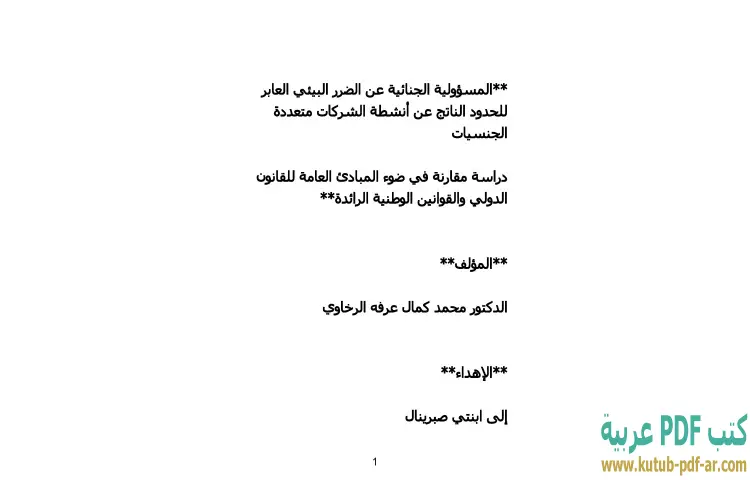 تحميل كتاب المسؤولية الجنائية عن الضرر البيئي العابر للحدود PDF – محمد كمال الرخاوي – يستعرض كتاب "المسؤولية الجنائية عن الضرر البيئي العابر للحدود الناتج عن أنشطة الشركات متعددة الجنسيات" للدكتور محمد كمال الرخاوي موضوعًا حيويًا يتعلق بالبيئة والقانون. يتناول الكتاب البحث في مدى مسؤولية الشركات متعددة الجنسيات عن الأضرار البيئية التي تتجاوز الحدود الوطنية، مما يسلط الضوء على التحديات القانونية التي تواجه الدول في هذا السياق.