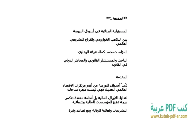 تحميل كتاب المسؤولية الجنائية في أسواق البورصة PDF – محمد كمال الرخاوي – يستعرض كتاب "المسؤولية الجنائية في أسواق البورصة – بين التلاعب الخوارزمي والفراغ التشريعي العالمي" للكاتب دكتور محمد كمال الرخاوي قضايا معقدة تتعلق بالمسؤولية الجنائية في ظل التطورات السريعة التي تشهدها أسواق المال. يتناول الكتاب تأثير التلاعب الخوارزمي على الأسواق المالية، حيث يسلط الضوء على كيفية استخدام التقنيات الحديثة في التداول، وما يترتب على ذلك من مشكلات قانونية وأخلاقية. كما يتناول الرخاوي الفجوات التشريعية الموجودة على الصعيدين المحلي والدولي، مما يثير تساؤلات حول كيفية تنظيم هذه الأسواق بشكل يتماشى مع الابتكارات التكنولوجية.
