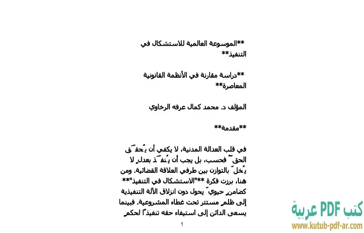 تحميل كتاب الموسوعة العالمية للاستشكال في التنفيذ PDF – محمد كمال الرخاوي – تتناول "الموسوعة العالمية للاستشكال في التنفيذ" لمؤلفها دكتور محمد كمال الرخاوي موضوعًا قانونيًا بالغ الأهمية، حيث تركز على دراسة الاستشكالات في التنفيذ من منظور مقارنة بين الأنظمة القانونية المعاصرة. يجسد الكتاب جهدًا علميًا متكاملًا يهدف إلى استكشاف القضايا المتعلقة بتنفيذ الأحكام والقرارات القضائية، وكيفية تعامل الأنظمة القانونية المختلفة مع هذه الاستشكالات.