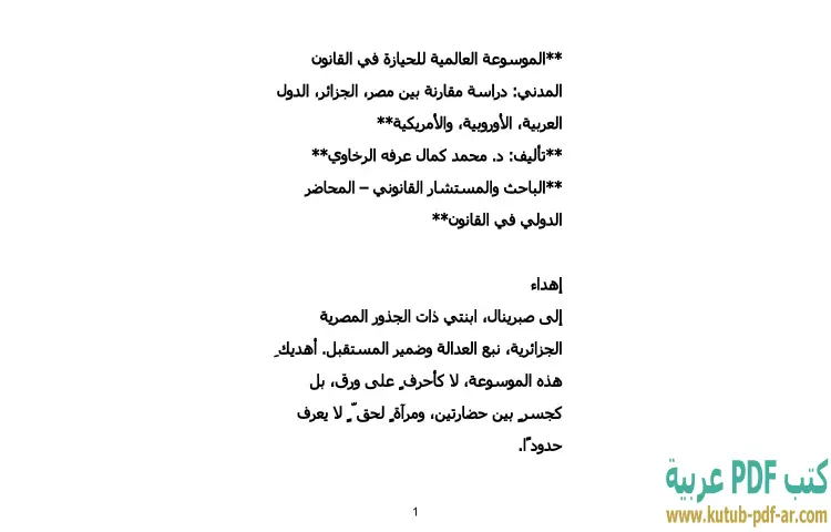 تحميل كتاب الموسوعة العالمية للحيازة في القانون المدني PDF – محمد كمال الرخاوي – تعد "الموسوعة العالمية للحيازة في القانون المدني" للدكتور محمد كمال الرخاوي من الأعمال المهمة التي تسلط الضوء على مفهوم الحيازة في الإطار القانوني. يجمع الكتاب بين دراسة مقارنة شاملة تعكس الفروقات والتشابهات بين الأنظمة القانونية في مصر والجزائر، إضافة إلى بعض الدول العربية والأوروبية والأمريكية. يهدف هذا العمل إلى تقديم تفسير شامل لمفهوم الحيازة وأهميته في القانون المدني، ما يجعله مرجعًا قيمًا للباحثين والدارسين في هذا المجال.