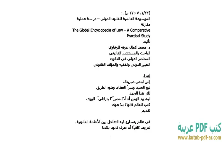 تحميل كتاب الموسوعة العالمية للقانون الدولي PDF – محمد كمال الرخاوي – تقدم "الموسوعة العالمية للقانون الدولي" دراسة شاملة ومفصلة حول الأنظمة القانونية المختلفة، حيث يعد هذا العمل من إعداد الدكتور محمد كمال عرفه الرخاوي، الذي يتمتع بخبرة واسعة كمستشار قانوني وباحث ومحاضر دولي. تبرز هذه الموسوعة جهود الرخاوي في تقديم تحليل مقارن للأنظمة القانونية، مما يسهل على القارئ فهم الفروق والسمات المميزة لكل نظام.
