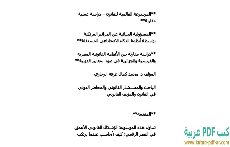 تحميل كتاب الموسوعة العالمية للقانون PDF – محمد كمال الرخاوي – يتناول كتاب "المسؤولية الجنائية عن الجرائم المرتكبة بواسطة أنظمة الذكاء الاصطناعي المستقلة" للدكتور محمد كمال عرفه الرخاوي موضوعًا معاصرًا يتقاطع فيه القانون مع التكنولوجيا الحديثة. يؤسس الرخاوي من خلال هذا العمل لفهم عميق للتحديات القانونية التي تطرحها أنظمة الذكاء الاصطناعي، خاصة في ما يتعلق بالمسؤولية الجنائية. يسعى المؤلف إلى إجراء دراسة مقارنة بين الأنظمة القانونية المصرية والفرنسية والجزائرية، مستندًا إلى المعايير الدولية، مما يتيح للقارئ استكشاف الفروقات والتشابهات في كيفية تعامل هذه الأنظمة مع الجرائم التي قد ترتكبها هذه الأنظمة المستقلة.