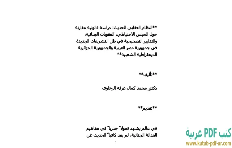 تحميل كتاب النظام العقابي الحديث PDF – محمد كمال الرخاوي – يتناول كتاب "النظام العقابي الحديث: دراسة قانونية مقارنة" للدكتور محمد كمال الرخاوي موضوع الحبس الاحتياطي والعقوبات الجنائية والتدابير التصحيحية من منظور قانوني متعمق. يستعرض الكاتب التشريعات الجديدة في جمهورية مصر العربية والجمهورية الجزائرية الديمقراطية الشعبية، مما يتيح للقارئ فهم الفروقات والتشابهات بين النظامين العقابيين في البلدين.