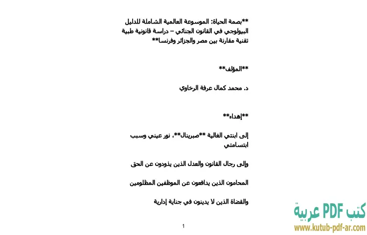 تحميل كتاب بصمة الحياة PDF – محمد كمال الرخاوي – تقدم "بصمة الحياة: الموسوعة العالمية الشاملة للدليل البيولوجي في القانون الجنائي" للدكتور محمد كمال الرخاوي دراسة قانونية طبية تقنية تتناول موضوعًا حيويًا يجمع بين البيولوجيا والقانون الجنائي. يتناول الكتاب مقارنة شاملة بين الأنظمة القانونية في مصر والجزائر وفرنسا في سياق استخدام الدليل البيولوجي، مما يجعله مصدرًا غنيًا للمعلومات اللازمة لفهم العلاقة بين العلم والقانون.