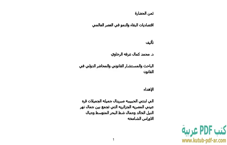 تحميل كتاب ثمن الحضارة PDF – محمد كمال الرخاوي – يستعرض كتاب "ثمن الحضارة: اقتصاديات البقاء والنمو في العصر العالمي" للدكتور محمد كمال الرخاوي قضايا اقتصادية معاصرة بأسلوب علمي متين. يتناول المؤلف في هذا العمل التحديات التي تواجهها المجتمعات في سعيها نحو التقدم والنمو في ظل العولمة والتغيرات الاقتصادية السريعة. يعرض الرخاوي مفاهيم جديدة تتعلق بكيفية تحقيق التنمية المستدامة والتوازن بين الموارد والاحتياجات، مما يضع القارئ أمام واقع اقتصادي معقد يتطلب فهماً عميقاً.