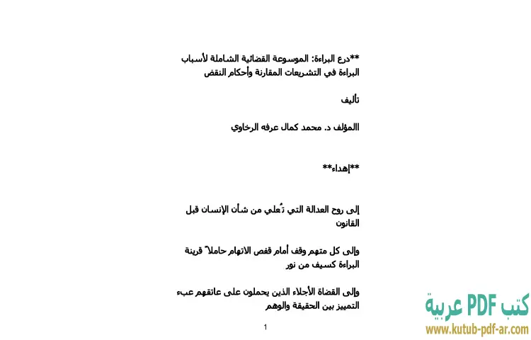 تحميل كتاب درع البراءة PDF – محمد كمال الرخاوي – يقدم كتاب "درع البراءة – الموسوعة القضائية الشاملة لأسباب البراءة في التشريعات المقارنة وأحكام النقض" للدكتور محمد كمال الرخاوي دراسة معمقة في مجال القانون الجنائي. يركز الكتاب على مفهوم البراءة كحق أساسي للمتهم، ويستعرض مختلف الأسباب القانونية التي تؤدي إلى البراءة في السياقات التشريعية المقارنة. يعكس الكتاب فهمًا عميقًا للتطورات القانونية المتعلقة بحقوق الإنسان، ويعتمد على تحليل شامل لأحكام النقض التي تساهم في تشكيل الفهم القانوني للبراءة.