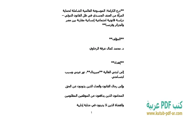 تحميل كتاب درع الكرامة PDF – محمد كمال الرخاوي – يتناول كتاب "درع الكرامة: الموسوعة العالمية الشاملة لحماية المرأة من العنف الجسدي في ظل القانون الدولي" للدكتور محمد كمال الرخاوي دراسة قانونية اجتماعية إنسانية تسلط الضوء على حقوق المرأة في مواجهة العنف الجسدي. يستعرض المؤلف من خلال هذا الكتاب القوانين والسياسات المتبعة في دول مختلفة، مثل مصر والجزائر وفرنسا، مع التركيز على الفروقات والتشابهات بينها.